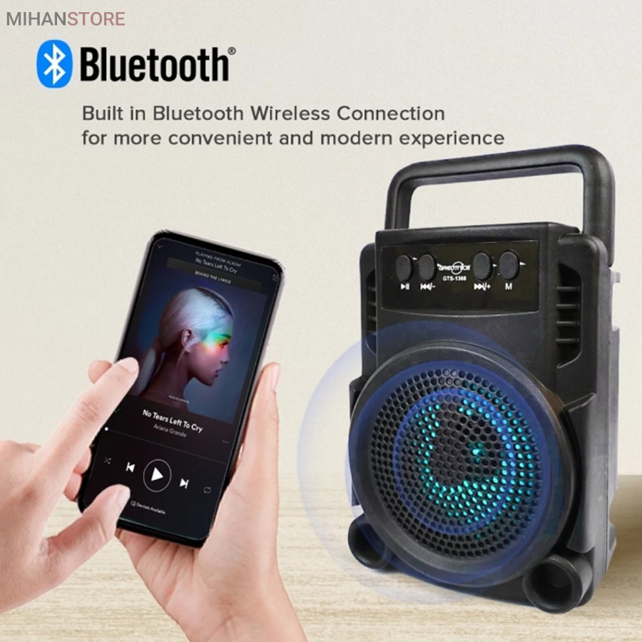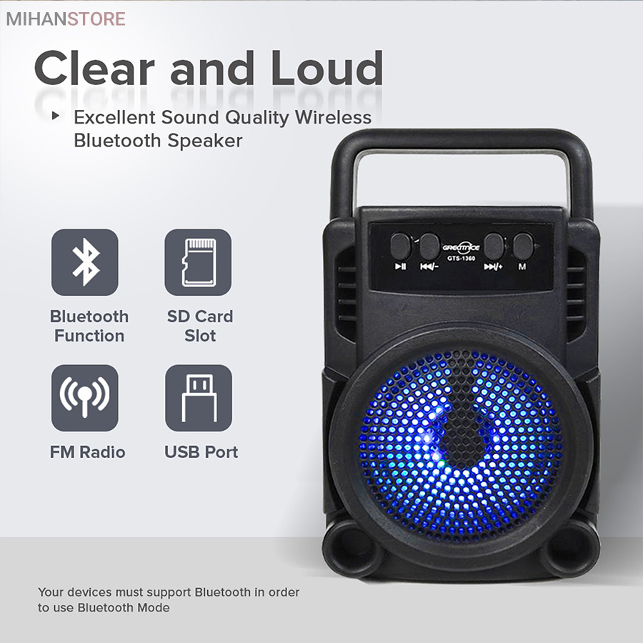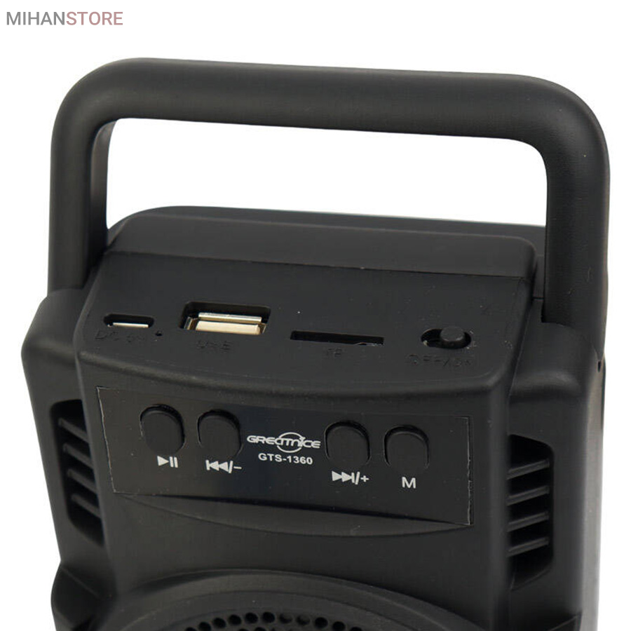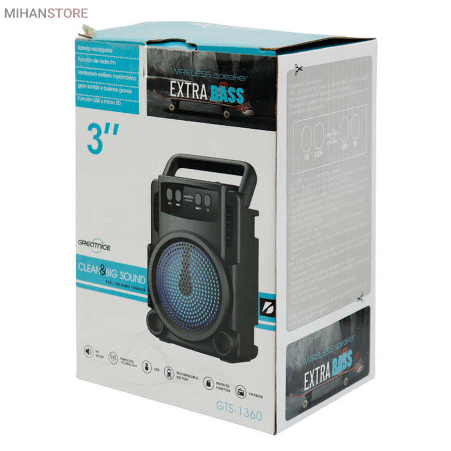 اسپیکر بلوتوثی قابل حمل Fantastic Quality مدل GTS - 1360  یا گریت نایس طراحی زیبا و جمع و جور دارد که مناسب برای پیاده روی ، کوهنوردی ، مسافرت و … می باشد. این اسپیکر داری رقص نور ال ای ادی می باشد. یکی از تفریحات لذت‌بخش، گوش‌کردن به آهنگی دوست‌داشتنی و شاد در گردش‌ها همراه دوستان است. زمانی ضبط ‌صوت‌ها همراه بسیار خوبی برای ارایه‌ی موسیقی در هر مکانی بودند؛ ولی با پیشرفت تکنولوژی و منسوخ‌ شدن استفاده از نوار کاست‌ها، ضبط‌ صوت‌ها جای خود را به اسپیکرهای قابل‌حمل دادند. اسپیکرهای قابل‌حمل معمولا برای تامین انرژی خود از یک باتری داخلی قدرتمند استفاده می‌کنند. این اسپیکر برای اتصال به تلفن همراه، پخش‌کننده‌ی صوتی و حتی رایانه و لپ‌تاپ از فناوری بلوتوث بهره می‌برد. اندازه‌ی بسیار کوچک در برابر قدرت بالای این اسپیکر شما را شگفت‌زده خواهد کرد. برای استفاده از این اسپیکر تنها کافی است آن را از طریق بلوتوث به پخش‌کننده‌ی صوتی خود متصل کنید و از صدای قدرتمند آن لذت ببرید.