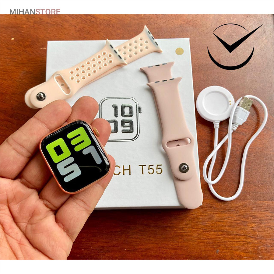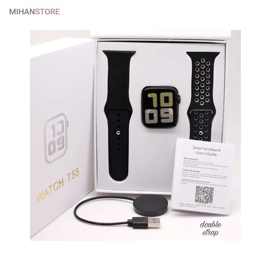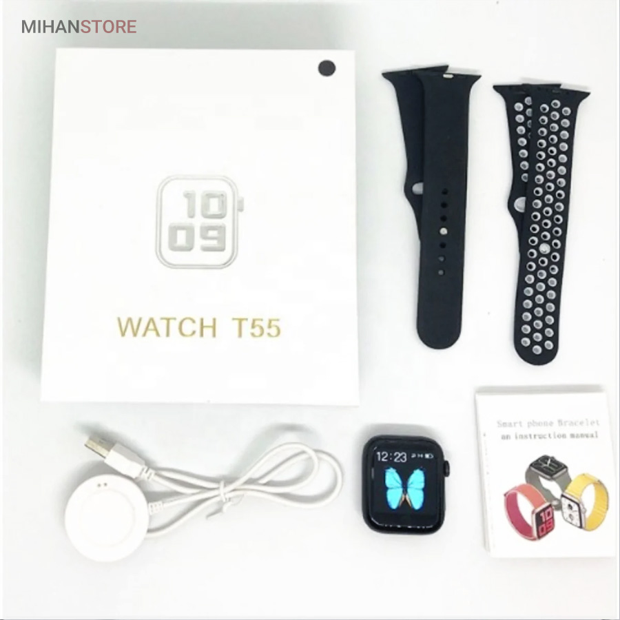 با صفحه نمایش 1.54 inch که برای آن تعبیه شده لذت ببرید.این ساعت کاملا لمسی میباشد که تمام صفحه نیست و حاشیه دارد. از مزیت های قابل ذکر این محصول میتوانیم با قابلیت اتصال به بلوتوث جهت همسان سازی با گوشی اشاره کنیم،ساعت هوشمند مدل T55 با وجود دارا بودن حسگر شتاب سنج،قابلیت رد تماس،تنظیم هشدار روزانه،ژیروسکوپ و شمارنده ضربان قلب،تعیین اهداف ورزشی و..جذابیت ساعت را بیشتر کرده است. همچنین این ساعت به تمامی دستگاه های اندرویدی وIos متصل خواهد شد،این گجت هوشمند توسط یک کابل مغناطیسی شارژ میشود.ساعت های هوشمندی که مشابه اپل واچ های شرکت اپل می باشد بسیار محبوب و پر فروش می باشند. ساعت هوشمند T55 با ظاهری مشابه واچ های اپل، با قیمت مناسب و امکاناتش حرفی برای گفتن پیدا کرده است. ساعت هوشمند T55 سبک، دارای وزن 32 گرم و با بند 42 گرم است.