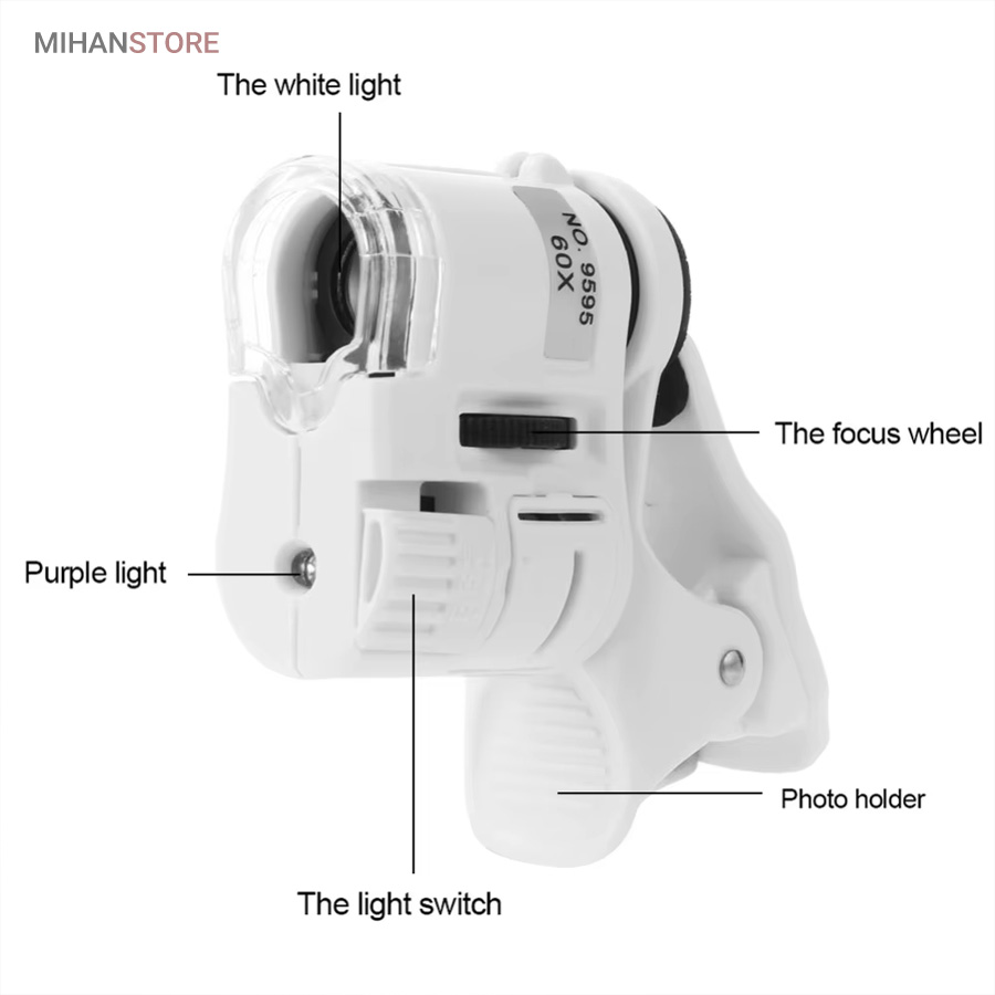 میکروسکوپ موبایل 60x یونیورسال مدل 9595 ذره بینی کوچک و قابل حمل در جیب با زوم 60 برابر و مدل کلیپسی گیره دار مناسب اتصال به گوشی موبایل میباشد.موبایل های هوشمند امروزی از بسیاری از کامپیوتر های چند سال قبل هم سریع تر و هم قوی تر شده اند از این رو هر روزه گجت های متنوع و کاربردی فراوانی مخصوص موبایل طراحی شده و معرفی می شوند.این میکروسکوپ موبایل با بزرگنمایی 60 برابر در واقع یک لنز مخصوص موبایل است که به همراه کلیپس خود می تواند بروی دوربین انواع موبایل نصب شده و دوربین موبایل رو به یک میکروسکوپ تبدیل کند. پس اگر به دنبال میکروسکوپ قابل حمل هستید، این گجت گزینه مناسبی می باشد.این میکروسکوپ موبایل با قدرت بزرگنمایی 60 برابری، دارای قیمت ارزان و کیفیت قابل قبولی می باشد و دارای توان مصرفی پایینی است که امکان نصب بر روی انواع تلفن همراه و تبلت ها قابل نصب می باشد.از آنجائیکه منبع نور این دستگاه درست در امتداد لنز اصلی آن قرار داشته و نور از بالا بروی نمونه تابیده می شود از این رو برای رویت سطح هر جسمی میتوان از آن استفاده نمود مانند سطح کاغذ، سطح برگ، مشاهده مدارهای الکترونیکی (مدار چاپی)، مشاهده جواهرات و سنگ های قیمتی، مشاهده امور مختلف زمین شناسی ، استفاده برای صنعت چاپ و دهها صنعت دیگر.دارای دو عدد چراغ LED می باشد که یکی از آنها سفید و برای روشن کردن زمینه بوده و چراغ دوم نور آبی UV جهت تست اسکناس می باشد.قسمت بالائی این ذره بین همانند تلسکوپ یا دوربین تک چشمی بصورت طولی بزرگ و یا کوچکتر می شود؛ و امکان زوم را میدهد.کلید این ذره بین دو حالته می باشد و با باطری کوچک ساعت کار می کند و بسیار کم مصرف است.فاصله ای که از جسم مورد نظر باید گرفت تا واضح دیده شود مماس تا 1 سانتی متر میباشد.