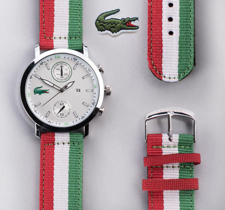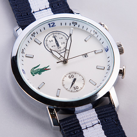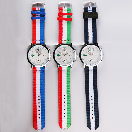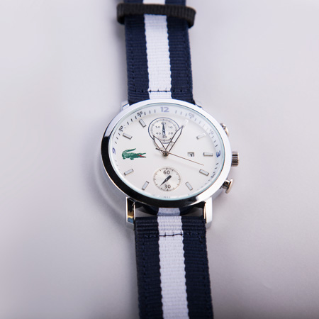 الگو برداری این ساعت از تسمه ی مشهور ناتو می باشد که با ترکیب خطوط رنگ ها و ادغام آن ها با یکدیگر بندی زیبا و شیک ارائه کرده است. برای اولین بار تسمه ناتو در نیروی دریایی بریتانیا استفاده شد که دلیل اصلی تولید و استفاده از آن زنگ نزدن بند ساعت برای آن دسته از غواصانی بود که مدام در حال شنا کردن بوده و به گذر زمان توجه خاصی داشته اند، از این رو برای جلوگیری از زنگ زدن بند ساعت ها و همچنین داشتن ظاهری انعطاف پذیر که به آن ها کمک کند از تسمه ی ناتو استفاده میکردند. بعد از مدتی برند لاگوست نیز با الهام از آنان شروع به تولید گسترده ی ساعت ها با چنین بندهایی کرد.