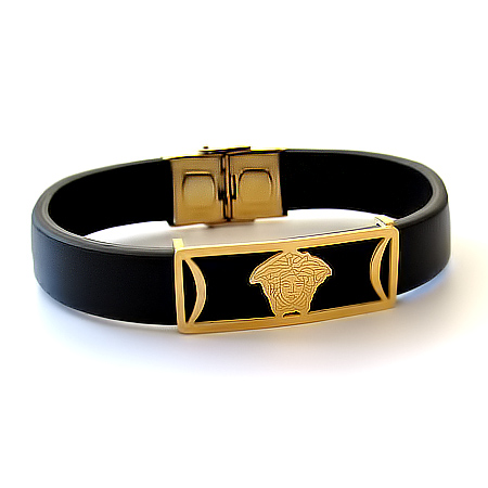 دستبند چرمی طرح ورساچه با دو رنگ قهوهای و مشکی و پلاک نازک طلایی ورساچه نمونهای از زیورهای ساده و در عین حال پرطرفدار از جانب آقایان و خانوم ها است که با اکثر رنگهای لباس همخوانی داشته و در عین حال متفاوت دیده میشود. این دستبندها مناسب ترین هدیه برای جوانان شیک پوش است.