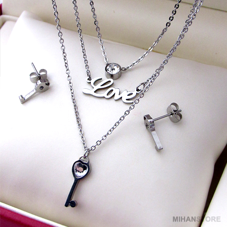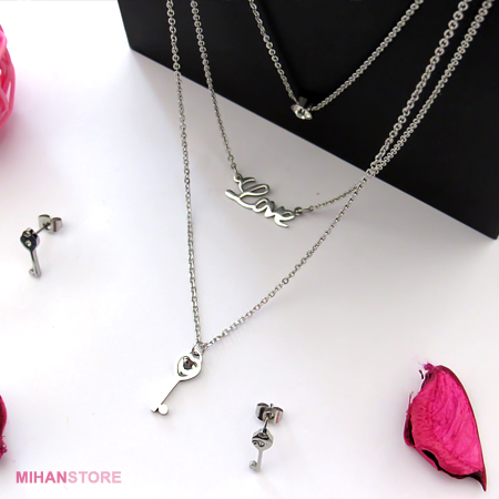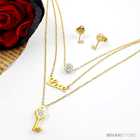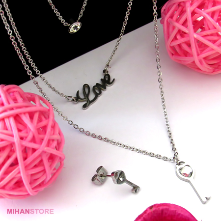این نیم ست فوق العاده زیبا دارای گردنبندی سه زنجیره با پلاک های نگین درشت،Love و کلید می باشد که سه زنجیر در انتها یکی شده و به راحتی با یک قفل به گردن شما آویخته می شود. از این رو بستن آن فوق العاده آسان و جلوه و نمای آن فوق العاده چشم گیر و مورد پسند افراد شیک پوش و خواستار تمایز می باشد. این نیم ست دارای دو گوشواره طرح کلید است که تکمیل کننده زیبایی گردنبند می باشد.