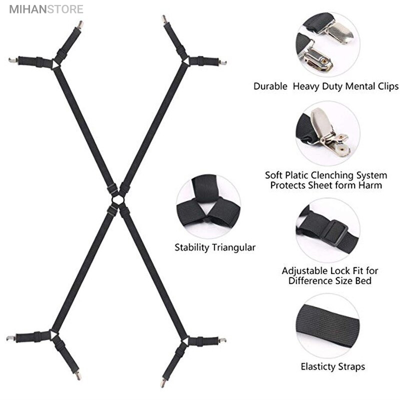 این گیره ها از که مرکز آن در وسط تخت بوده و به 4 گوشه ی ملحفه متصل شده و سفت آن را میکشد. همچنین با داشتن تسمه های تنظیم شونده ی طول برای هر سایز تشک و هر سایز ملحفه ای حتی تشک های سفارشی و در هر ابعادی مناسب می باشد. و علاوه بر تشک تخت برای نگه داشتن روکش ابزار و وسایل و… نیز مورد استفاده قرار میگیرد.
