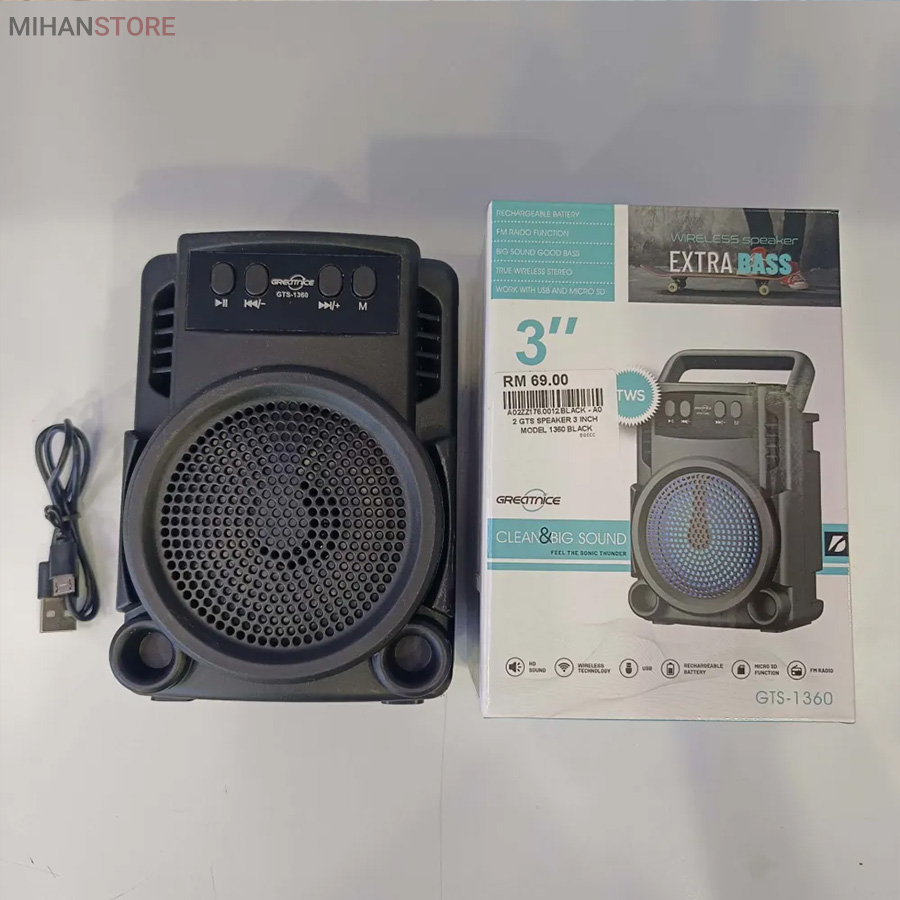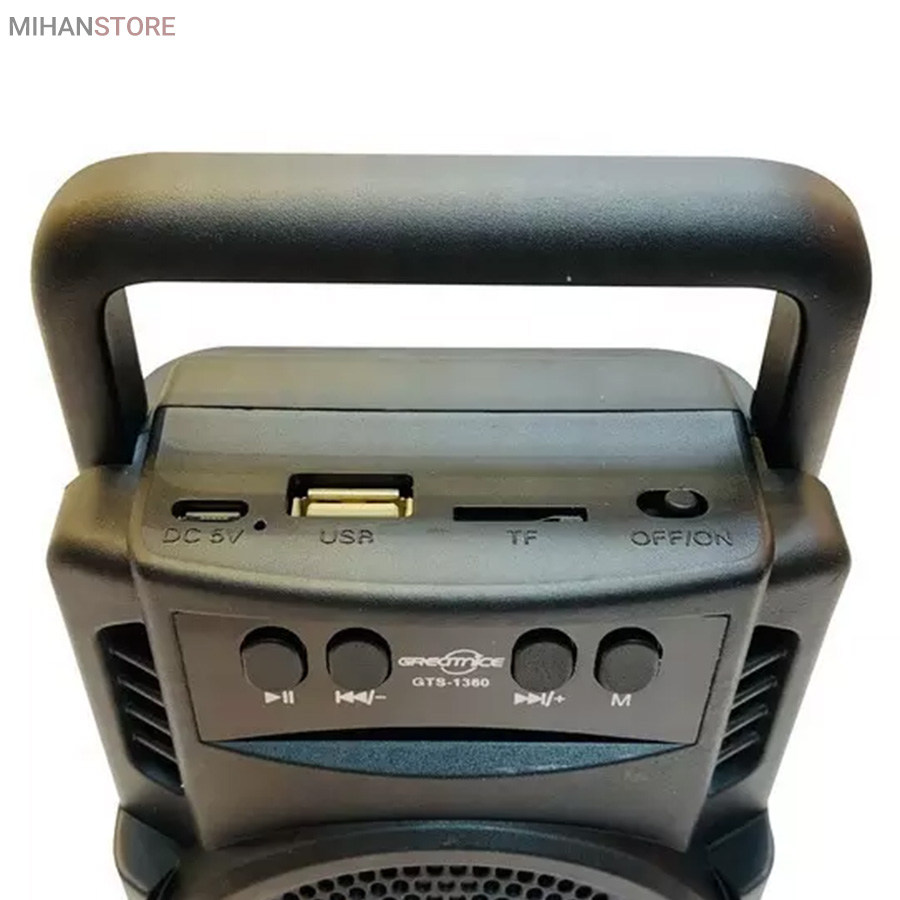 اسپیکر بلوتوثی قابل حمل Fantastic Quality مدل GTS - 1360  یا گریت نایس طراحی زیبا و جمع و جور دارد که مناسب برای پیاده روی ، کوهنوردی ، مسافرت و … می باشد. این اسپیکر داری رقص نور ال ای ادی می باشد. یکی از تفریحات لذت‌بخش، گوش‌کردن به آهنگی دوست‌داشتنی و شاد در گردش‌ها همراه دوستان است. زمانی ضبط ‌صوت‌ها همراه بسیار خوبی برای ارایه‌ی موسیقی در هر مکانی بودند؛ ولی با پیشرفت تکنولوژی و منسوخ‌ شدن استفاده از نوار کاست‌ها، ضبط‌ صوت‌ها جای خود را به اسپیکرهای قابل‌حمل دادند. اسپیکرهای قابل‌حمل معمولا برای تامین انرژی خود از یک باتری داخلی قدرتمند استفاده می‌کنند. این اسپیکر برای اتصال به تلفن همراه، پخش‌کننده‌ی صوتی و حتی رایانه و لپ‌تاپ از فناوری بلوتوث بهره می‌برد. اندازه‌ی بسیار کوچک در برابر قدرت بالای این اسپیکر شما را شگفت‌زده خواهد کرد. برای استفاده از این اسپیکر تنها کافی است آن را از طریق بلوتوث به پخش‌کننده‌ی صوتی خود متصل کنید و از صدای قدرتمند آن لذت ببرید.