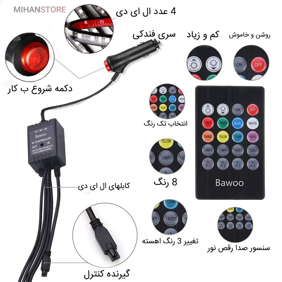 - دارای ریموت RGB برای تنطیم میزان شدت، رنگ و رقص نور