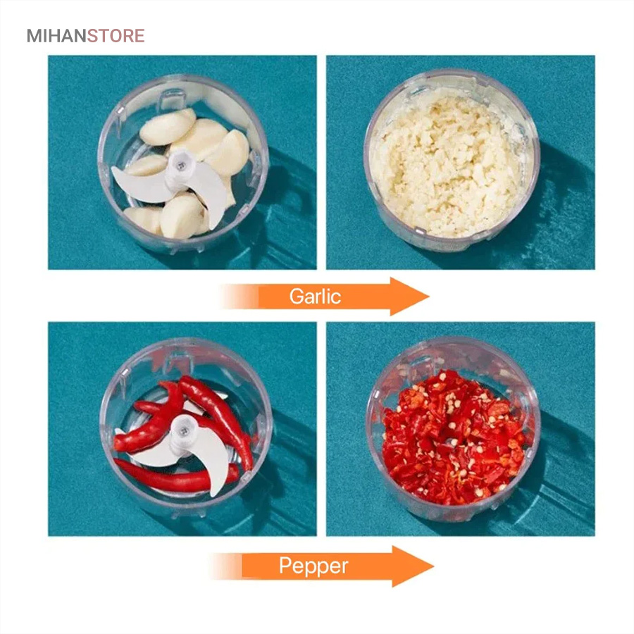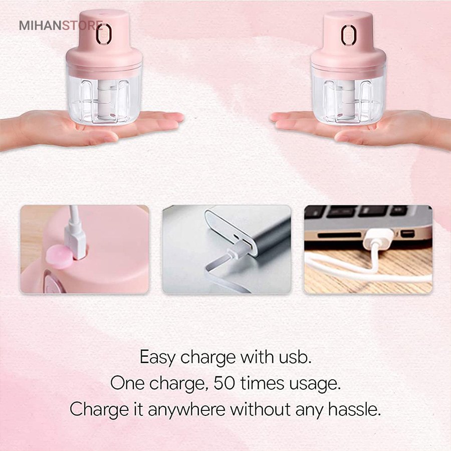 مینی خردکن شارژی یک خردکن 3 تیغه تیز است که به عنوان یک وسیله کاربردی برای خرد و میکس کردن سیر ، زنجبیل ، فلفل ، هویج ، سبزیجات ، پیاز و موارد دیگر بسیار مناسب است. طراحی عملکرد کلید لمسی مینی خردکن شارژی باعث می شود دست شما آزاد باشد تا موقع کار به کارهای دیگر خود برسید.این دستگاه با یک کابل USB و با ۳ ساعت شارژ ، می تواند از عمر طولانی باتری تا ۳۰ روز و استفاده گاهی اوقات لذت ببرید. این خردکن شارژی رو میتونید مسافرت یا کمپینگ هاتون هم همراه ببرید و از دست خرد کردن راحت بشید.این دستگاه ضدآب بوده و آب از محفظه زیرین به بالا و موتور نفوذ نمیکنه  این دستگاه از پلاستیک ABS ساخته شده و بسیار مقاوم بوده و همچنین تیغه ها ضدزنگ بوده.