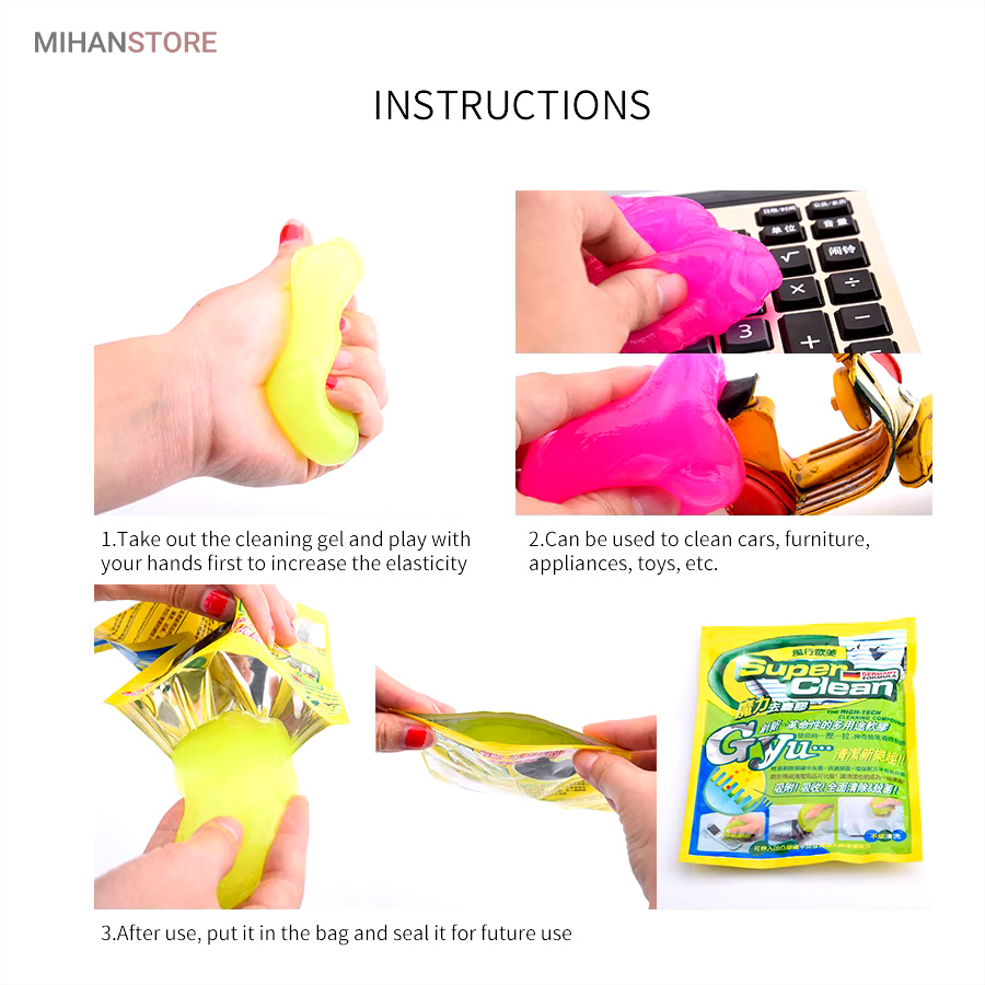 ژل جادویی تمیز کننده  Super Clean می توانید گرد و غبار و کثیفی را که بین کلیدهای صفحه کلید قرار می گیرد و هر مکانی که با اسباب بازی های کلیدی کودکانتان نمی تواند به آن دسترسی پیدا کند را تمیز کنید.ژل جادویی تمیز کننده Super Clean با ساختار جنبشی خود که به راحتی شکل می گیرد، به هر منطقه ای می رسد و آن را تمیز می کند. می توانید بارها از آن استفاده کنید. تنها کاری که باید انجام دهید این است که یک بار روی ناحیه گرد و خاکی و کثیف فشار داده و بکشید. محل کثیف در عرض چند ثانیه تمیز می شود و هیچ باقی مانده یا چسبندگی خمیر ژل روی سطوح اعمال شده وجود ندارد.