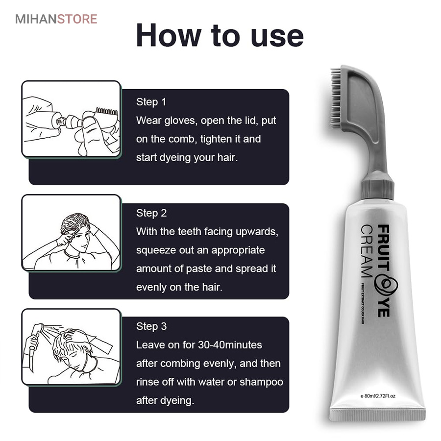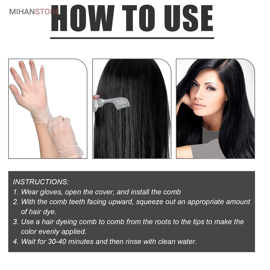 قبل از استفاده، شانه را بیرون آورده و روی بطری نصب کنید. قبل از استفاده از این محصول نیازی به شامپو زدن نیست، فقط با یک بار فشار دادن، رنگ مو خارج شده موهایتان را به طور یکنواخت شانه کنید و روی موهای خشک مثل شانه زدن رنگ مو را پخش کنید و 40 دقیقه تا 2 ساعت نگه دارید (زمان بستگی به نتیجه مو دارد) سپس مو های خود را بشویید.