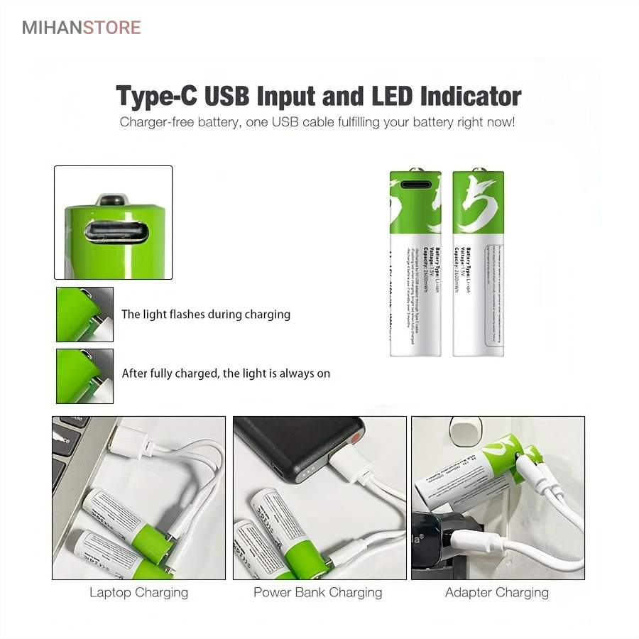 باطری قلمی قابل شارژ همچون یک پاور بانک عمل نموده و به راحتی قابل شارژ می باشند ، کابل شارژ باتری از نوع Type_C بوده و کافی است طرف USB را به دستگاه تامین کننده برق وصل نمایید تا ظرف 1-1.5 ساعت باتری ها شارژ شوند این باتری ها با قابلیت ۱۲۰۰ مرتبه شارژ از طول عمر بلند مدتی برخوردارند . مناسب برای ؛ مسواک های برقی ، ریموت کنترل ، ماوس بیسیم ، ماشین حساب ، گوشی تلفن ، اسباب بازی ها و ... میباشد این باتری ها دارای استانداردهای کیفیت CE & FCC میباشند .