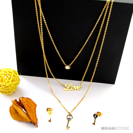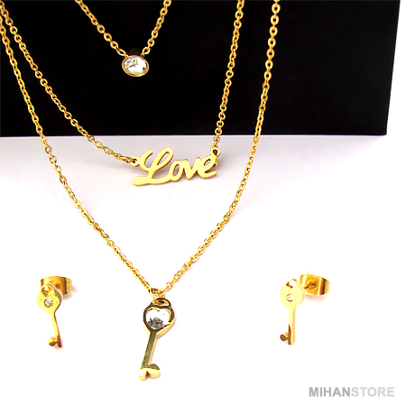 این نیم ست فوق العاده زیبا دارای گردنبندی سه زنجیره با پلاک های نگین درشت،Love و کلید می باشد که سه زنجیر در انتها یکی شده و به راحتی با یک قفل به گردن شما آویخته می شود. از این رو بستن آن فوق العاده آسان و جلوه و نمای آن فوق العاده چشم گیر و مورد پسند افراد شیک پوش و خواستار تمایز می باشد. این نیم ست دارای دو گوشواره طرح کلید است که تکمیل کننده زیبایی گردنبند می باشد.