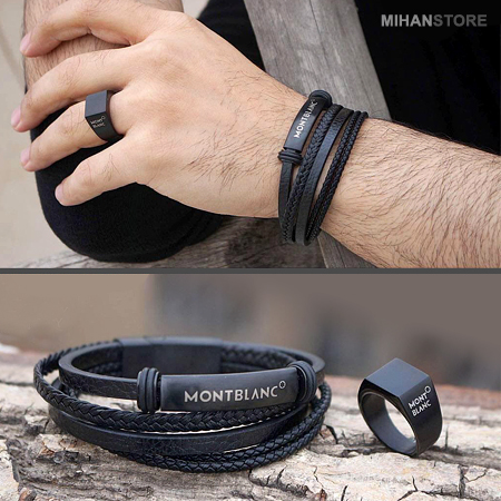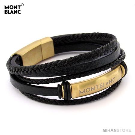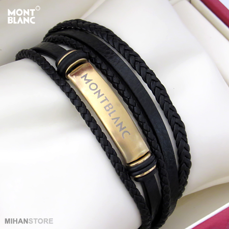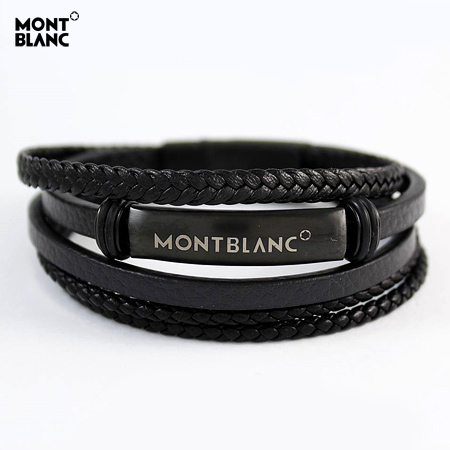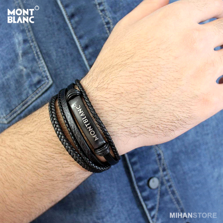 دستبند چرم طرح Montblanc نمونه‌ای از زیورهای ظریف و در عین حال پرطرفدار از جانب آقایان و خانم ها است که با اکثر رنگ‌های لباس همخوانی داشته و در عین حال متفاوت دیده می‌شود. این دستبند فوق العاده شیک از پنج لایه چرم به صورت ساده و بافته شده و نماد زیبای برند Montblanc با رنگ های لوگو مشکی و طلایی عرضه شده است.